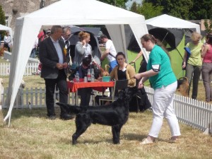 Fosse erreicht in der Zwischenklasse einen 1.Platz und gewinnt außerdem mit der Zuchtgruppe Erix. Ein schöner Tag mit netten Menschen und Gesprächen. Richterin war Yvonne Jaussi, die einige der Flatcoated Retriever-Bücher verfasst hat, die ich hier stehen habe. Es hat mich sehr gefreut, mal bei ihr im Ring zu stehen!